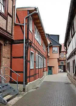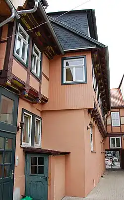 Der älteste Bau grenzt westlich an das straßenseitige Wohnhaus und stammt aus der Zeit um 1550. Die Fassade ist mit walzenförmigen Balkenköpfen, Schiffskehlen und Fächerrosetten verziert. Das Gebäude wurde jedoch in Teilen umgestaltet, das Erdgeschoss ist in massiver Bauweise ausgeführt. Westlich schließt sich ein Anbau aus gleicher Zeit an. Es folgen zwei Gebäude aus der Zeit um 1800 und der zweiten Hälfte des 19. Jahrhunderts. Auf der Südseite des Hofs befindet sich ein weiteres Fachwerkhaus. Es entstand im 18. Jahrhundert und enthält eine Schmiede.