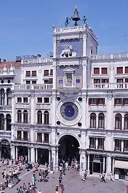 Der Uhrturm (Torre dell’Orologio) selbst wurde zwischen 1496 und 1499 von Mauro Codussi errichtet, die angrenzenden Flügelbauten (1502–1506) stammen von Pietro Lombardo und wurden 1755 von dem Architekten Giorgio Massari mit einem dritten Geschoss aufgestockt. Die astronomische Uhr mit ihrem Zifferblatt aus Lapislazuli zeigt die Mond- und Sonnenphasen und die Tierkreiszeichen an. Zwei riesige Figuren aus Bronze schlagen auf einer Bronzeglocke die Stunden an.