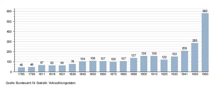 - ↑ Daten der Eidgenössischen Volkszählungen ab 1850 nach Gemeinden. (XLSX; 10 MB) Bundesamt für Statistik, Neuchâtel, 12. Juli 2024, abgerufen am 15. Mai 2025 (Öffnung in Excel nur über "Anhang/Excel-Datensatz" möglich).