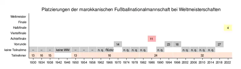 | 2022 | Katar | Spiel um Platz 3 | Kroatien | 4. | Walid Regragui | In der 2. Qualifikationsrunde setzte sich Marokko mit sechs Siegen gegen Guinea, Guinea-Bissau und den Sudan durch. In der dritten Runde setzte sich die Mannschaft gegen die Demokratische Republik Kongo durch und traf in Katar in der Gruppe auf Belgien, Kanada und Kroatien sowie im Achtelfinale auf Spanien, im Viertelfinale auf Portugal und im Halbfinale auf Frankreich. |