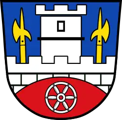 Blasonierung: „In Blau im Schildfuß einen roten Berg, belegt mit einem sechsspeichigen silbernen Rad, dahinter eine silberne Burg mit Zinnenturm, beseitet mit je einer goldenen Hellebarde, die aus der Mauer wachsen.“
