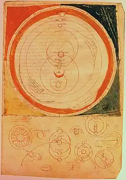 Das kosmographische Modell des Martianus Capella nach einer mittelalterlichen Zeichnung. Handschrift Florenz, Biblioteca Medicea Laurenziana, San Marco 190, fol. 102r (11. Jahrhundert)