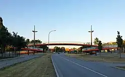 Die geschwungene Stahlkonstruktion ruht auf zwei Pylonen in Kreiselform, die eine Art von Stadttor bilden. Darüber führt ein Fuß- und Radweg auf Kunstharzbelag.