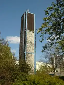 Der Glockenturm ist circa 15 Meter hoch, auf dem Flachdach erhebt sich ein vier Meter hohes Kreuz aus Edelstahl. In seinem Inneren befinden sich drei Bronzeglocken, die die Namen „Ruf“, „Sammlung“ und „Sendung“ tragen.