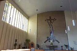 Der Innenraum wurde beim Umbau völlig neu gestaltet. Das Holzgewölbe wurde durch eine flache Betondecke ersetzt. An der Stirnseite, hinter dem Altar, wurde ein Mosaik angebracht, das den Gekreuzigten darstellt. Es ist ein Werk des Künstlers Eugen Keller aus Höhr-Grenzhausen. Die 1978 eingebaute Orgel stammt von der Orgelbaufirma Ott in Göttingen.