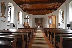 Die einschiffige Saalkirche hat südlich einen Fassadenturm mit einem Spitzhelm. Das Langhaus hat eine Flachdecke.