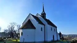 Die Kirche ist ein verputzter Bruchsteinbau in der Art romanischer Dorfkirchen, der inmitten eines Friedhofs liegt. Sie besteht aus einem Saal mit eingezogenem Chor und halbrunder Apsis und wird im Westen durch zwei Strebepfeiler abgestützt. Das Bauwerk wird durch ein Satteldach mit Dachreiter und einem Treppengiebel im Osten abgeschlossen. An der Nordseite sind noch romanische Fenster erhalten, die übrigen wurden im Jahr 1683 vergrößert. Ein spitzbogiges Portal im Norden aus der Zeit um 1400 erschließt das Bauwerk. Im Westen und im Süden wurden zweigeschossige Anbauten hinzugefügt. In der Eingangshalle ist das romanische Südportal mit Rundbogen, umlaufendem Sockelprofil und eingelegtem Rundwulst erhalten. Das Innere ist flachgedeckt, die Apsis hat keine Fenster, Eingeschossige Emporen sind im Westen und an der westlichen Hälfte der Südseite eingebaut.