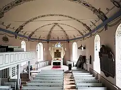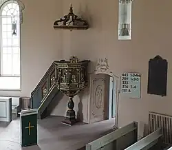 Die nach 1635 gefertigte Kanzel auf der Südseite neben der Sakristei zeigt Reliefs der Evangelisten.