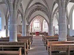 Das heutige Kirchengebäude ist eine Pseudobasilika, die sich in vier Joche untergliedert. An das Langhaus schließt sich ein nach Osten ausgerichteter Chorraum an.[5]