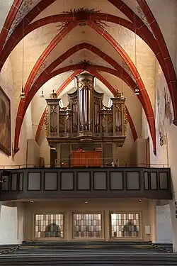 Die an den Seiten geschwungene Westempore im Mittelschiff hat kassettierte Füllungen und ist Aufstellungsort der Orgel. Unterhalb der Empore ist eine neuzeitliche Holzwand mit Glasfenstern eingezogen, die den Eingangsbereich abtrennt und als Windfang dient. Der Fußboden der Kirche ist mit roten Sandsteinplatten belegt.