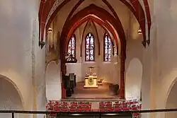 Der gotische Ostchor hat ein Joch und einen Fünfachtelschluss mit Kreuzrippengewölbe. Er wird außen mit den Jahreszahlen 1509 und 1709 bezeichnet. Die Rippen ruhen auf Konsolen, deren nördlicher einen Wappenschild trägt, der Kelch und Hostie zeigt.[5] Im Inneren öffnet ein spitzbogiger Triumphbogen mit roter Quaderbemalung und Fase an der Westseite den Chor zum Mittelschiff. Die beiden Schlusssteine werden mit Flammenornamenten umgeben. Gegenüber dem Mittelschiff ist der Chor um zwei Stufen erhöht. Die vier zweiteiligen Chorfenster mit flachen Spitzbögen und schrägen Gewänden haben spätgotisches Maßwerk.[15] Maßwerk und Umrahmung sind aus rotem Sandstein gefertigt. Die Außenwände des Chors werden durch zwei umlaufende, rote Gesimse gegliedert, die sich vom weißen Außenputz abheben. Ein Gesims ist am Sockel und ein weiteres unterhalb der Chorfenster angebracht.