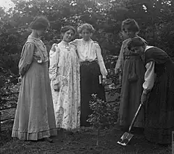Millicent Browne beim Setzen eines Gedenkbaums im Garten des Eagle House mit Mary Phillips, Vera Wentworth, Elsie Howey und Annie Kenney (von links)