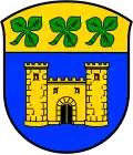 Blasonierung: „Unter goldenem (gelbem) Schildhaupt, darin drei schräglinks liegende grüne Kleeblätter, in Blau eine zweitürmige goldene (gelbe) Zinnenburg mit schwarzem Tor.“ |
