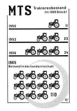 Mit der Gründung der ersten Landwirtschaftlichen Produktionsgenossenschaften (LPG) 1952 wurden die MAS in Maschinen-Traktoren-Stationen (MTS) umgewandelt.[3] Die LPGen erhielten die Dienste zu niedrigsten Konditionen. Die MTS arbeiteten nicht kostendeckend, und der Staat subventionierte über den Umweg MTS die Landwirtschaft und die LPGen im Besonderen. 1952 mussten die Stationen politische Abteilungen einrichten, die durch Schulungen die Traktoristen auf den „richtigen“ ideologischen Kurs bringen sollten.[8]