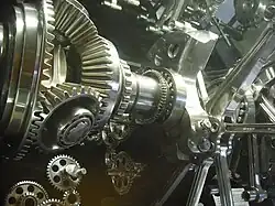 Teil einer Maschine bestehend aus zahlreichen Maschinenelementen (Zahnräder, Wälzlager, Kurbelwellen)