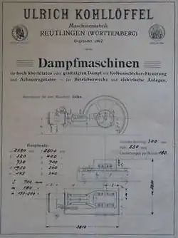 Die Maschinenfabrik Ulrich Kohllöffel in Reutlingen wurde 1862 gegründet und war von 1898 bis 1913 ein führender Hersteller von Dampfmaschinen.[1]