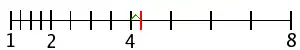 Als Beispiel soll ein Zahlensystem zur Basis 2 mit der Mantissenlänge 3 genommen werden. Die normalisierte Mantisse kann die Werte 1,002=1, 1,012=1,25, 1,102=1,5 und 1,112=1,75 haben. Das Bild zeigt die entsprechenden Gleitkommazahlen im Bereich 1 bis 8.