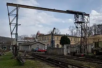 Nachdem in der neugegründeten DDR kaum Steinkohlevorkommen lagen, Braunkohle aber in großen Mengen zur Verfügung stand, wurde auch die Feuerung der Dampflokomotiven in Löbau auf Braunkohle und Braunkohlebriketts umgestellt. Ab 1. Januar 1955 gehörte die Lokeinsatzstelle Löbau zur neu gegründeten Reichsbahndirektion Cottbus und erhielt fortan auch wieder Steinkohlelieferungen aus Polen und später auch aus der Ukraine.[55] Um 1960 wurden am südlichen Kohlegleis Modernisierungen vorgenommen. So wurde ein neuer Ausschlack-Kanal errichtet, welcher fortan mit maschineller Unterstützung entleert werden konnte. Der dazu errichtete Portalkran erstreckt sich über das Kohlegleis und ein ebenfalls neu angelegtes Stumpfgleis für den Schlacke-Wagen.[56]