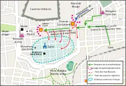 Am 8. Mai, dem Tag der Befreiung zum Ende des Zweiten Weltkriegs in Europa, demonstrierte die PPA wieder. Eine Menge von etwa 10.000 Algeriern marschierte auf das Europäerviertel zu. Die Demonstranten forderten Gleichheit, Unabhängigkeit und „Algerien den Arabern“. Die Polizei war unterbesetzt, weil viele europäische Männer wegen des Krieges noch immer in Europa waren und Vichy-Anhänger entlassen worden waren. Die Ersatzkräfte waren Franzosen ohne Ortskenntnisse. Etwa 20[1] Gendarmen versuchten, den Demonstranten ihre Fahnen zu entreißen – bei dieser Gelegenheit wurde erstmals die grün-weiße algerische Fahne mit rotem Stern und Halbmond geschwungen. Es fielen Schüsse, von denen sowohl Polizisten als auch Demonstranten getroffen wurden. Ein achtjähriges jüdisches Mädchen[1] war das erste Todesopfer.