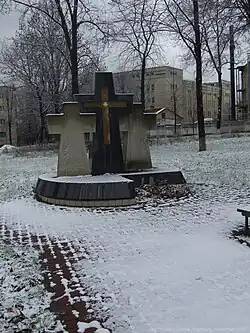 Ebenfalls im Juni 2005 wurde gegenüber dem Park vor der Heiligen Auferstehungskirche an der Chmelnyzkyj-Chaussee ein Denkmal errichtet, das drei Kreuze darstellt. Die Inschrift im flachen, runden Sockel ist aufgrund ihrer Gestaltung kaum zu entziffern. Sie lautet: „Gedenken wir den unschuldig Getöteten, 1937/1938.“ Dieser Gedenkstein befindet sich nicht genau am Orte der früheren Massengräber, die auf dem Alten Friedhof auf der rückwärtigen Seite der Kirche gefunden worden waren. Der Friedhof besteht schon lange nicht mehr, hier erinnert nichts an die Tragödie der 1930er Jahre. Auf einem Teilstück des ehemaligen Friedhofs, auf dem sich einige der Massengräber befunden hatten, wurde vor etwa 20 Jahren ein mehrgeschossiges Wohnhaus errichtet.[27]