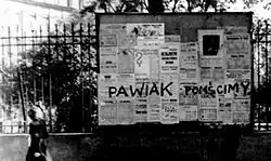 Das Wirken der Okkupation wurde durch eine Welle von Straßenrazzien am 13. Oktober 1943 verstärkt, die von den Deutschen fast jeden Tag, nicht selten auch mehrmals und an unterschiedlichen Stellen veranstaltet wurden.[23] Am 16. Oktober 1943 kam es zur ersten öffentlichen Hinrichtung auf der Straße, nämlich an der Ecke von Aleja Niepodległości und Ulica Madalińskiego.[24] Die Namen der Opfer wurden in den Mitteilungen durch die Straßen-Megaphonen bekannt gegeben, genauso wie die Ankündigung der Hinrichtung der nächsten (namentlich genannten) Geiseln im Falle eines weiteren anti-deutschen Attentats in Warschau. Das diente dem Zweck, einen psychologischen Effekt hervorzurufen. Nach einiger Zeit wurden Megaphon-Durchsagen durch an den Mauern aufgehängte Bekanntmachungen ersetzt.[9] Auf den Straßen von Warschau erschienen am 30. Oktober 1943 zum ersten Mal berühmte, auf rosa Papier gedruckte Plakate mit vermeintlich unbekannter Unterschrift „SS- und Polizeiführer im Distrikt Warschau“.