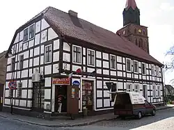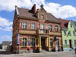 Die im Zweiten Weltkrieg unzerstört gebliebene Altstadt ist von Bausubstanz aus dem 18. und 19. Jahrhundert geprägt, darunter das von 1821 bis 1827 errichtete und 1920 aufgestockte Rathaus der Stadt, das Postamtsgebäude sowie die gotische Stadtkirche Unserer Lieben Frau von Tschenstochau, eine dreischiffige Hallenkirche aus dem 13. Jahrhundert. Das Untergeschoss des Turms wurde aus geglätteten Granitquadern errichtet. Die bis 1945 evangelische Kirche ist seitdem katholisch.