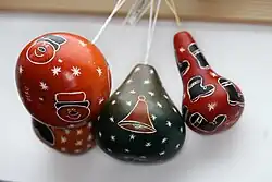 Bei diesen typischen Produkten des peruanischen Kunsthandwerks aus dem nach dem Río Mantaro benannten Valle del Mantaro in der Provinz Huanta in der Ayacucho-Region, wird die Kürbisoberfläche mit glühenden Holzstäben unterschiedlich stark gebräunt, wobei helle Töne durch Ausschnitzen erreicht werden.