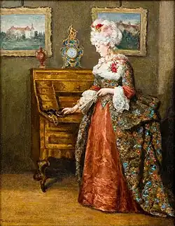 - 1???: Dame in Rokokokostüm an kleinem Sekretär, eine Miniatur betrachtend (Öl auf Leinwand, 48 × 62 cm)[58]
