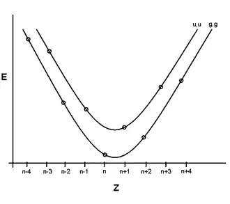 Die Bindungsenergien der Atomkerne können nach dem Tröpfchenmodell beschrieben werden. Wenn die Nukleonenzahl ungerade ist (u,g- und g,u-Kerne), kann die Bindungsenergie der Nuklide in Abhängigkeit von der Protonenzahl (Ordnungszahl) durch eine Parabel dargestellt werden. Das Nuklid am Scheitelpunkt der Parabel ist stabil, die benachbarten Nuklide können sich durch β−-Zerfall bzw. β+-Zerfall und Elektroneneinfang umwandeln. Bei gerader Nukleonenzahl gibt es zwei Parabeln, wobei die Parabel der instabileren u,u-Kerne über der der g,g-Kerne liegt.