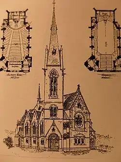 Bei den Bauarbeiten an der geosteten neogotischen Kirche kam es in einer frühen Bauphase am 27. Oktober 1892 zum Einsturz des Turms. Dabei wurden große Teile des bereits aufgemauerten Langhauses zerstört. Da die Ursache für den Einsturz in einer unzureichenden Fundamentierung lag, musste die Bauruine vollständig abgetragen werden. Längere gerichtliche Auseinandersetzungen verzögerten zunächst einen erneuten Baubeginn.