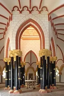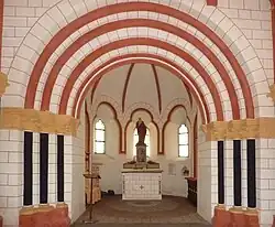 Das Mauerwerk besteht aus Schieferbruchstein, teilweise mit Tuffstein durchsetzt. Die Hauptsäulen im Innenraum sind aus Basaltlava, Nebensäulen aus Schiefer, nichttragende Formen aus Sandstein. Die Konsolen der Säulen im oberen Teil des Mittelbaus tragen Symbole der vier Evangelisten, die Skulptur eines Jünglings und auf der sechsten Konsole nicht zu deutende Figuren. Auffallend ist der Adler statt des Löwen als Symbol des Evangelisten Markus, möglicherweise ein Fehler der 1894 abgeschlossenen Restaurierung, wie es dem Spruchband der Skulptur entnommen werden könnte.