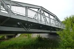 Die damals neue Technik des Lichtbogenschweißens ermöglichte ein Gesamtgewicht von 56 t im Gegensatz zu einer konventionell genieteten Fachwerkbrücke mit 70 t.[3] Von der Konstruktionsmethode abgesehen handelte es sich um eine gewöhnliche Fachwerkbrücke mit zwei Längsträgern aus geraden unteren und näherungsweise parabolischen, polygonalen oberen Hauptträgern.[1] Zusätzlich zu den zwei Fahrspuren gab es zwei Bürgersteige für Fußgänger.[1]