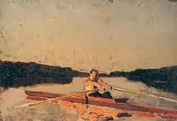 In der Mitte des Bildes hat sich Eakins ebenfalls in einem Einer selbst dargestellt. Auf der Rückwand des Bootes findet sich Eakins’ Signatur. Er rudert von Schmitt weg.