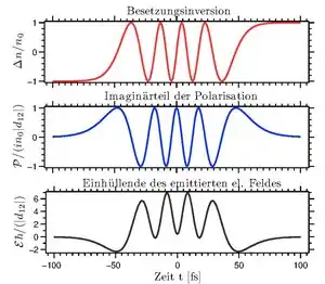 {\displaystyle {\begin{aligned}\partial _{t}{\vec {P}}^{+}&=-d_{12}e^{i\Omega t}n_{0}{\vec {e}}_{\vec {E}}\left(i\Omega c_{1}^{\star }c_{2}+{\dot {c}}_{1}^{\star }c_{2}+c_{1}^{\star }{\dot {c}}_{2}\right)\\&=i\Omega {\vec {P}}^{+}-{\frac {i}{\hbar }}|d_{12}|^{2}E(t)\underbrace {n_{0}\left(|c_{1}|^{2}-|c_{2}|^{2}\right)} _{=-\Delta n}.\end{aligned}}}