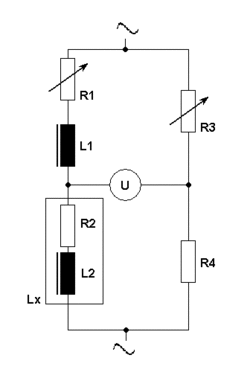 L1, R1 liegen in einem Zweig mit der zu messenden Induktivität Lx, bestehend aus dem Induktivitätswert L2 und dem äquivalenten Serienwiderstand (Verlustwiderstand) R2