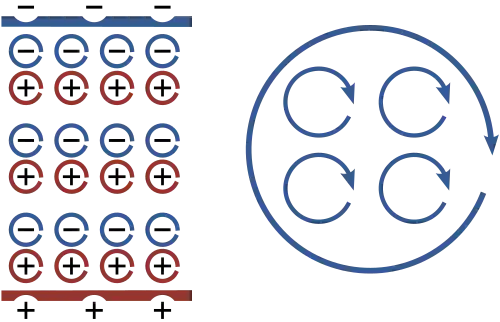 | Durchflutungsgesetz Die Wirbel des Magnetfeldes hängen von der Leitungsstromdichte und von der elektrischen Flussdichte ab. |