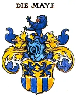 In Johann Siebmachers Wappenbuch von 1605 ist das Wappen der May bei den ehrbaren Geschlechtern der Reichsstadt Augsburg dargestellt, allerdings verballhornt mit Greifen statt Löwen im Schild. Bartholomäus II. May († 1576) war es, der 1537 nach Augsburg auswanderte. Kaiser Karl V. erkannte ihm und seinen Brüdern 1551 einen Adelsbrief zu. 1561–1576 gehörte er dem kleinen Rat Augsburgs als Vertreter der Gesellschaft der Mehrer[6] an. Sein Enkel Marcus von May († 1643) wurde Mitglied des Stadtgerichts und 1631 Bürgermeister von Augsburg.[7] 1627 erfolgte für ihn zu Prag die kaiserliche Aufnahme zu den edlen und ratsfähigen Geschlechtern als Patrizier von Augsburg.[8]