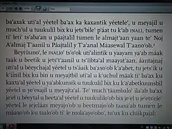 Es gibt auch eine 1992 vollendete[6] vollständige Bibelübersetzung auf Mayathan.[7] Diese von protestantischen Übersetzern verwirklichte Maya-Bibel wird allerdings laut einer Recherche von 2007 in der katholischen Kirche nicht verwendet und auch andernorts nur gelegentlich gelesen. Als größte Hindernisse beim Lesen werden fehlende Maya-Lesekenntnisse der Mayas sowie komplizierte, schwer verständliche Sätze in den Bibeltexten genannt.[8] Lokale katholische Priester halten Gottesdienste nur auf Spanisch. All dies führt dazu, dass Maya die Bibel auf Spanisch und nicht in der protestantischen Version auf Mayathan lesen.[9] Die Zeugen Jehovas vollendeten 2012 eine Neue-Welt-Übersetzung des Neuen Testaments;[10] sie betreiben zudem eine mayathansprachige Version ihrer Website.[11]