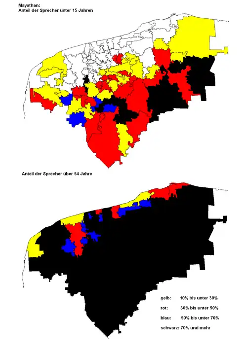 Im Bundesstaat Yucatán spricht (Stand: 2010) noch in 52 von 106 Municipios eine Mehrheit die indigene Sprache; über 90 % liegt der Anteil noch (beim höchsten Anteil beginnend) in Tahdziú (98,98 %), Mayapán, Chikindzonot, Chacsinkín, Tixcacalcupul, Chankom, Chemax (90,75 %, mit insgesamt 33.490 Einwohnern größtes unter diesen Municipios), Chichimilá, Tixmehuac und Tekom.[4]
