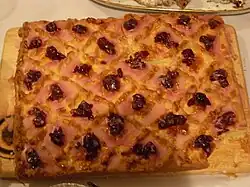 Mazurek (Plural: Mazurki) ist ein traditioneller Kuchen der polnischen Küche, der im polnischen Osterbrauchtum verwurzelt ist und neben der Babka seit Jahrhunderten zu Ostern gebacken wird.[1] Seine genaue Herkunft ist unbekannt. Mazurki sind relativ dünn, von variablem Umfang, tendieren zu rechtwinkligen Formen und sind am häufigsten als Blechkuchen anzutreffen.