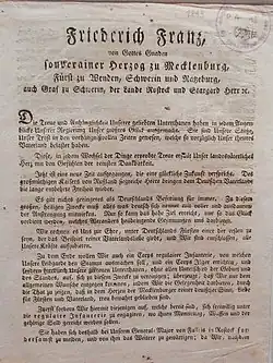 1815 wurden beide Landesteile durch den Wiener Kongress zu Großherzogtümern, ohne dass sich an der Einbindung beider Landesteile in den mecklenburgischen Gesamtstaat etwas änderte. Mecklenburg behielt seine staatliche Eigenständigkeit. Durch die Revolution in Mecklenburg (1848) kam es in Mecklenburg erstmals zu freien Wahlen. Der nachfolgende Versuch zur Einführung einer Verfassung und zur Umwandlung des Staates in eine konstitutionelle Monarchie scheiterte jedoch am Widerstand der Ritterschaft und des Strelitzer Großherzogs. Auch spätere Vorstöße der Regierungen und der Großherzöge beider Landesteile von Mecklenburg, darunter der letzte große Versuch einer Verfassungsreform „von oben“ zwischen 1908 und 1913, führten zu keinem Resultat.[6] Damit blieb das überlebte landständische Verfassungssystem bis zum Ende der Monarchie 1918 erhalten. Das Land zählte zuletzt zu den rückständigsten deutschen Territorien, insbesondere die Landbevölkerung lebte in ärmlichen Verhältnissen.[7] Erst die Abdankung von Friedrich Franz IV. als Großherzog von Mecklenburg-Schwerin und als Verweser von Mecklenburg-Strelitz machte den Weg frei zur politischen Moderne. Als einziges deutsches Land wandelten sich beide mecklenburgischen Teilstaaten ohne Zwischenschritt von einem feudalistisch geprägten ständestaatlichen System in eine parlamentarische Republik.[8]