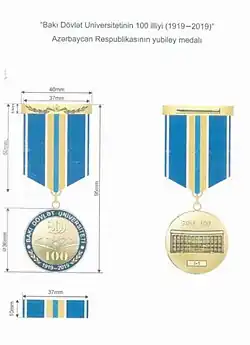 - ↑ a b c d e Regulations on the Jubilee Medal of the Republic of Azerbaijan "100th Anniversary of Baku State University (1919–2019)". In: Official website of the President of Azerbaijan. Abgerufen am 27. Dezember 2019 (aserbaidschanisch).
