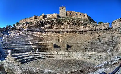 - Die Ruinen eines römischen Theaters wurden zu Füßen des Burghügels freigelegt.