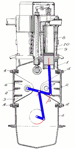 Anfang der 1950er Jahre entwickelte die Lever Motors Corp. aus Charleston, USA einen „gleichstromgespülten Zweitaktmotor mit Einlassventilen und Auslassschlitzen“.[4] Kern dieser Entwicklung war eine geänderte Anlenkung des Pleuels an einem Schwinghebel, der im Motorgehäuse drehbar gelagert wurde. Ziel dieser veränderten Kinematik des Kurbeltriebs war es, eine längere Verweildauer des Kolbens im unteren Totpunkt (wegen der dann verlängerten Zeit für den – bei Zweitaktmotoren wichtigen – Spülvorgang) zu realisieren. Dies hatte in der Theorie einige positive Effekte auf Motorlauf und -Wirkungsgrad. Die längere Verweildauer im unteren Totpunkt ließ dem Motor mehr Zeit für den Auslass der entstandenen Abgase, wodurch die Wärmeabgabe erhöht und das Luftgemisch für den nachfolgenden Takt verbessert wurde. Weiterhin bewirkte die Führung durch den Schwinghebel eine geringere Schrägstellung des Pleuels, woraus ein ruhigerer Lauf resultieren sollte.