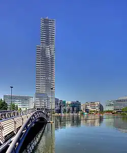 Der in der Kölner Neustadt-Nord gelegene Mediapark ist ein oberirdisch autofreier Gebäudekomplex, dessen einzelne Bauwerke durch Fußgängerwege miteinander verbunden sind, der Lieferverkehr und die Zufahrt erfolgen über eine unterirdische Ringstraße. Die siebenstöckigen Gebäude mit dem Kölnturm als Akzent sind halbkreisförmig um einen zentralen Platz mit künstlichem See angeordnet, womit eine (post-)moderne Variante der Piazza del Campo in Siena angedeutet werden soll.[5][6] Sie wurden nicht gleichzeitig, sondern in teilweise größerem zeitlichen Abstand errichtet.