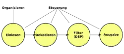 Abgesehen von spezialisierten oder bewusst einfachen Playern bedienen sie sich oft einer modularen Plug-in-Architektur, um möglichst flexibel zu sein. Diese Plug-ins arbeiten in einer Kette, die aufgrund der Benutzereinstellungen programmintern zusammengebaut wird. Der Benutzer kann dabei stets auf die einzelnen Komponenten zugreifen und ihnen Befehle geben. Im Folgenden wird genauer auf die einzelnen Funktionalitäten eingegangen.