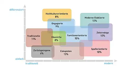 | Moderne Etablierte | aktiv, kritisch und liberal, mit souveräner Grundhaltung, kulturaffin, breit interessiert | 10 % |