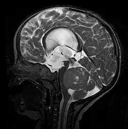 Medulloblastom in der MRT, sagittal T2w. Der Tumor dehnt sich im Wesentlichen innerhalb des 4. Ventrikels aus (dunkel, untere Bildmitte).