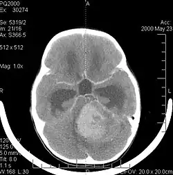 Medulloblastom im Schädel-CT nach Kontrastmittelgabe bei einem sechsjährigen Mädchen.