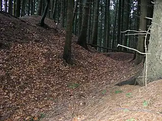 Der ehemalige Burggraben ist 800 Jahre nach Abbruch der Burg erkennbar | |